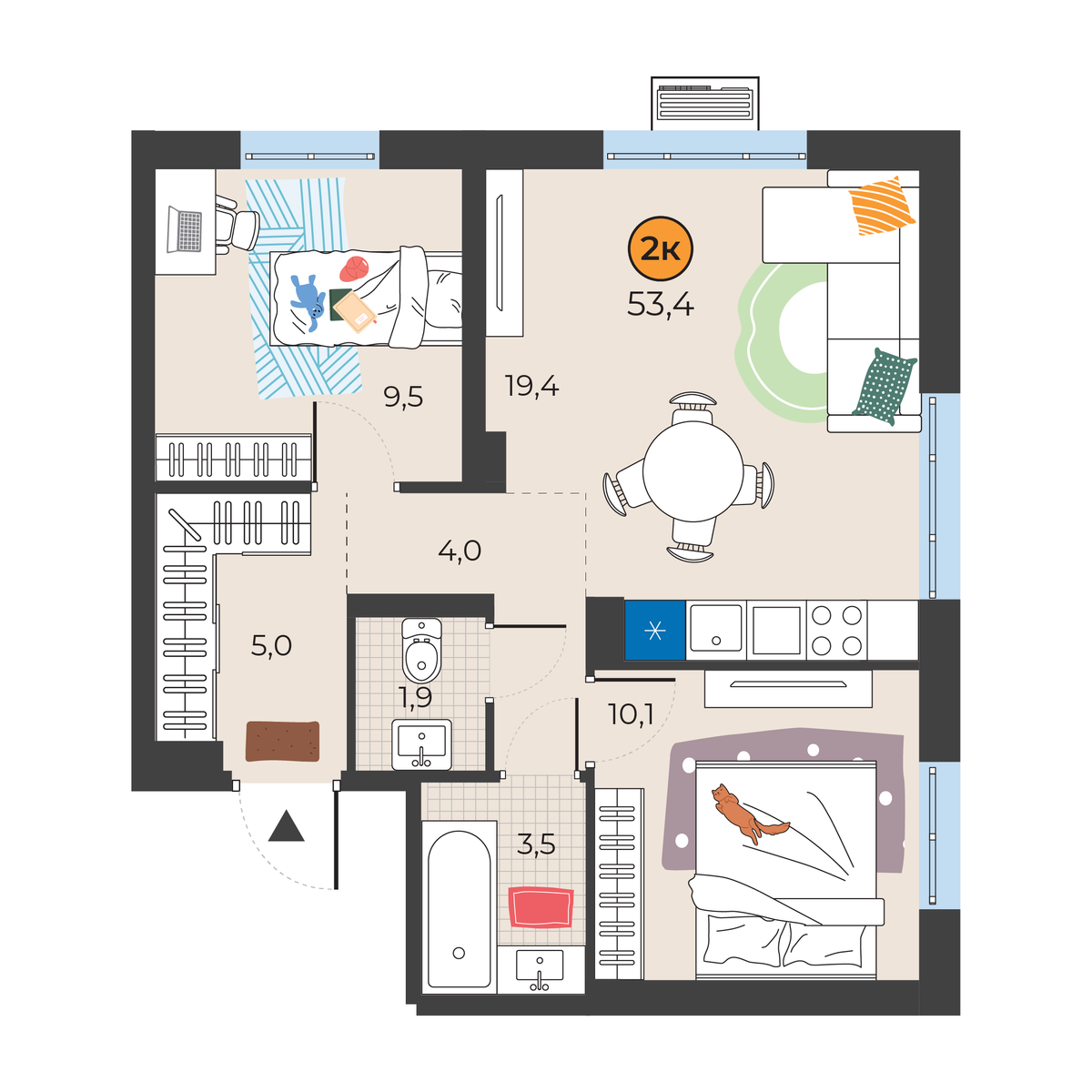 2-комнатная квартира 53.4 м2