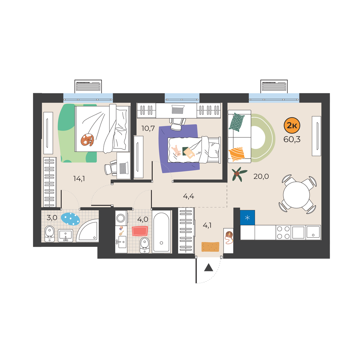 2-комнатная квартира 60.3 м2