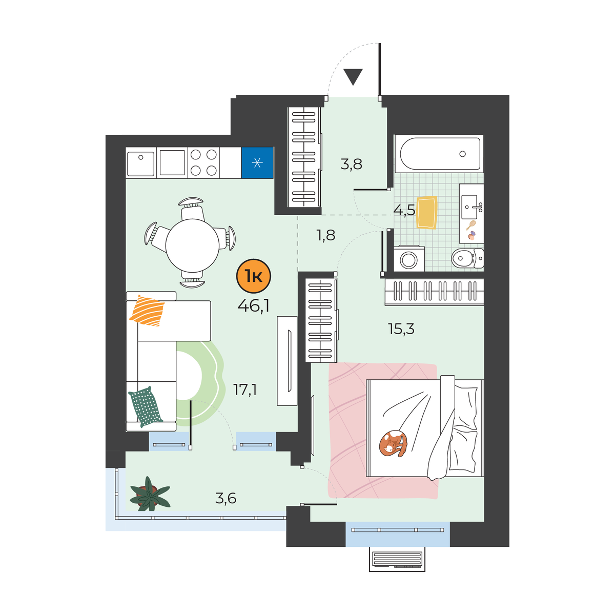1-комнатная квартира 46.1 м2