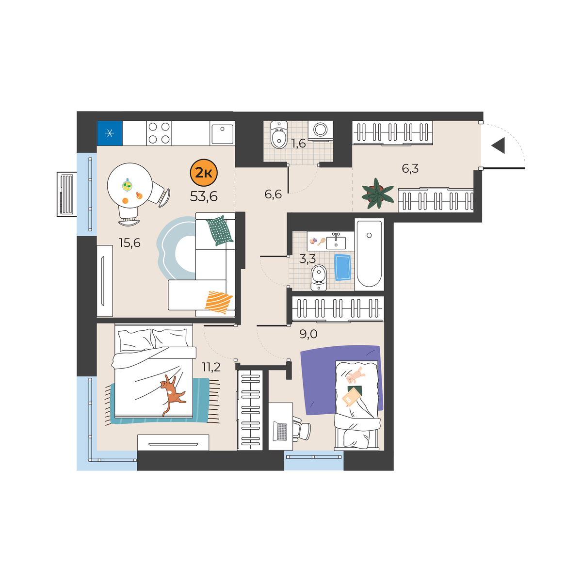 - Площадь53.6 м2