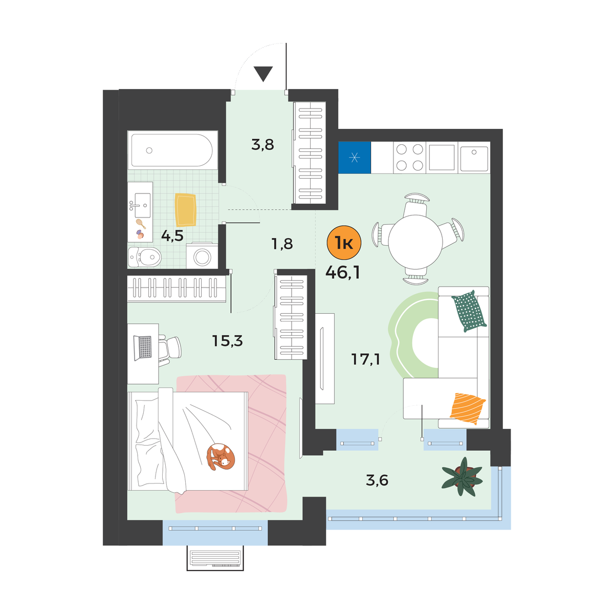 1-комнатная квартира 46.1 м2
