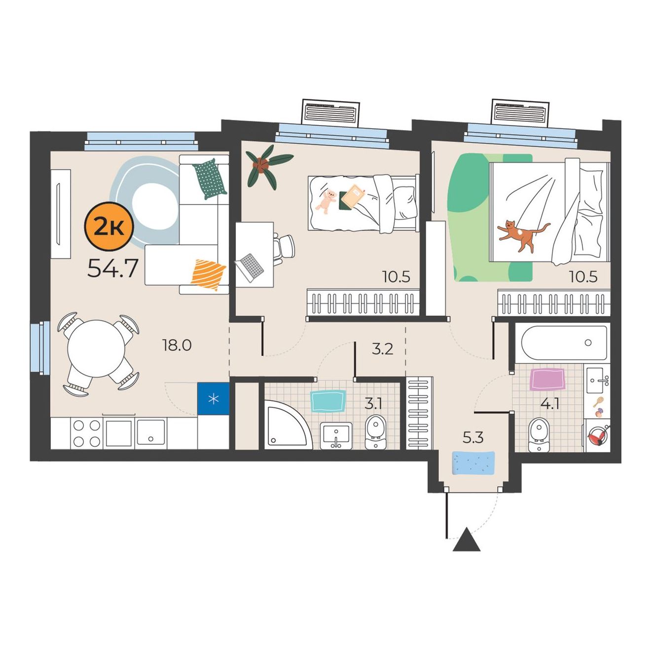 - Площадь54.7 м2