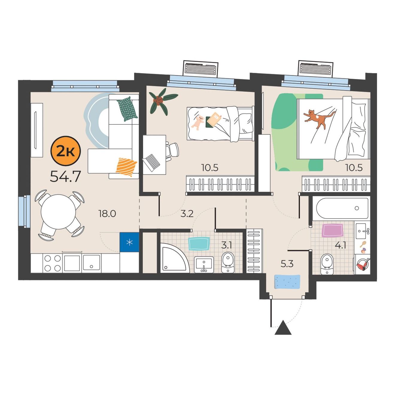 2-комнатная квартира 54.7 м2