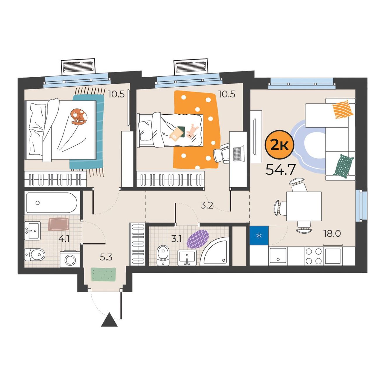 2-комнатная квартира 54.7 м2