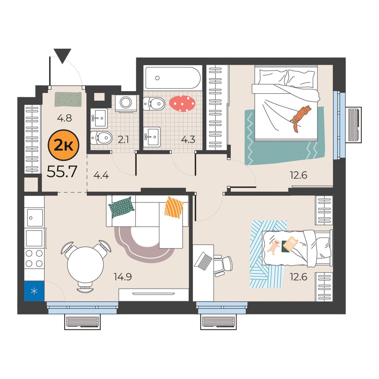 2-комнатная квартира 55.7 м2
