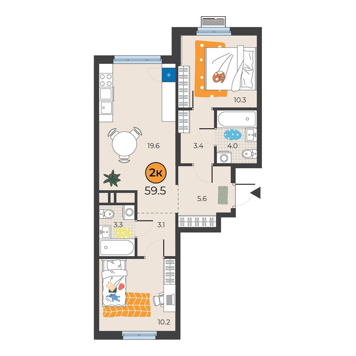 2-комнатная квартира 59.5 м2