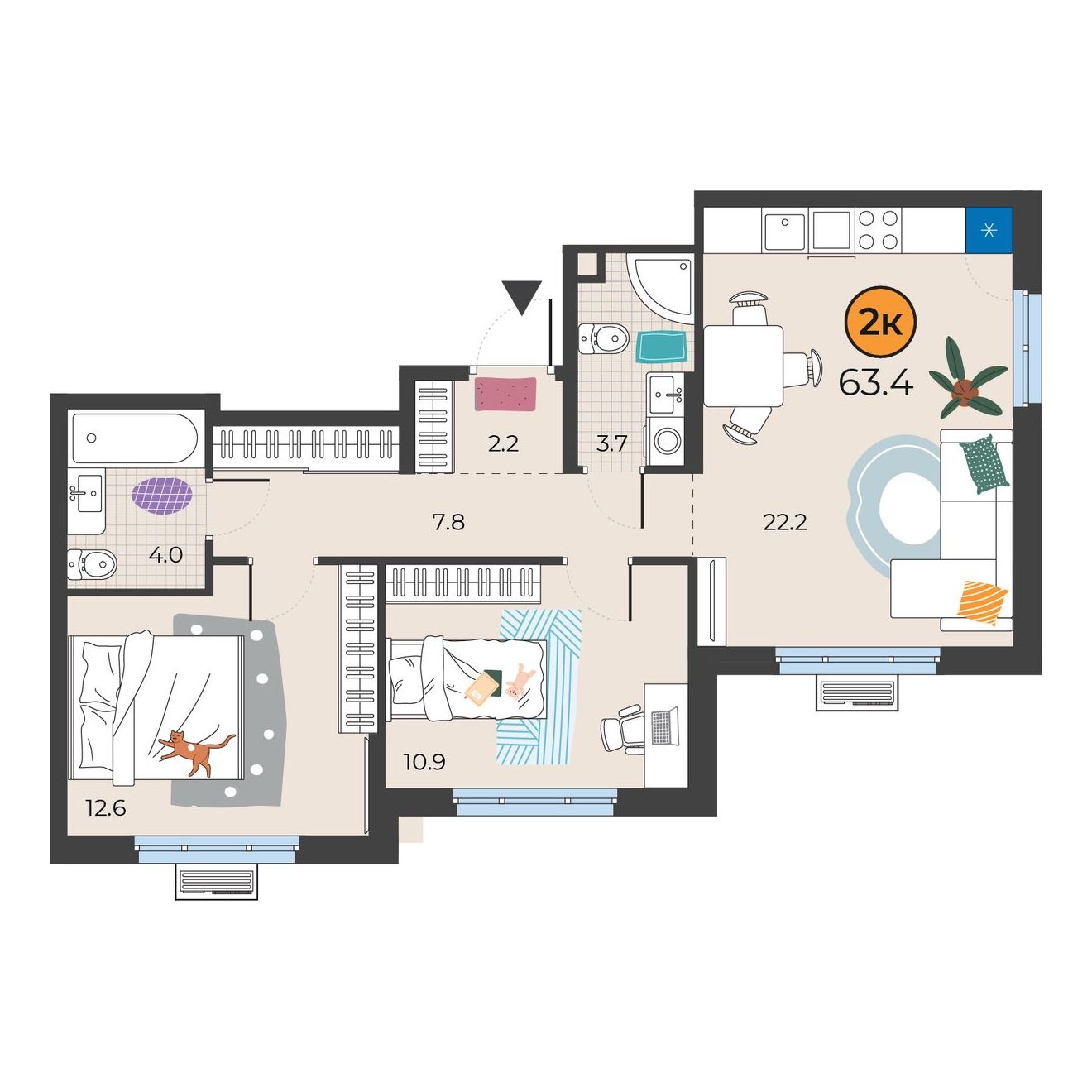 2-комнатная квартира 63.4 м2