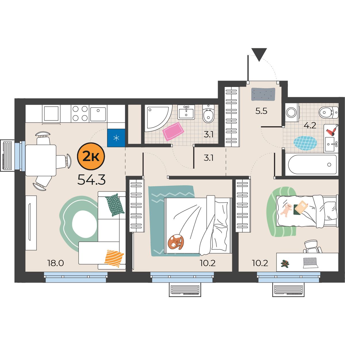 2-комнатная квартира 54.3 м2