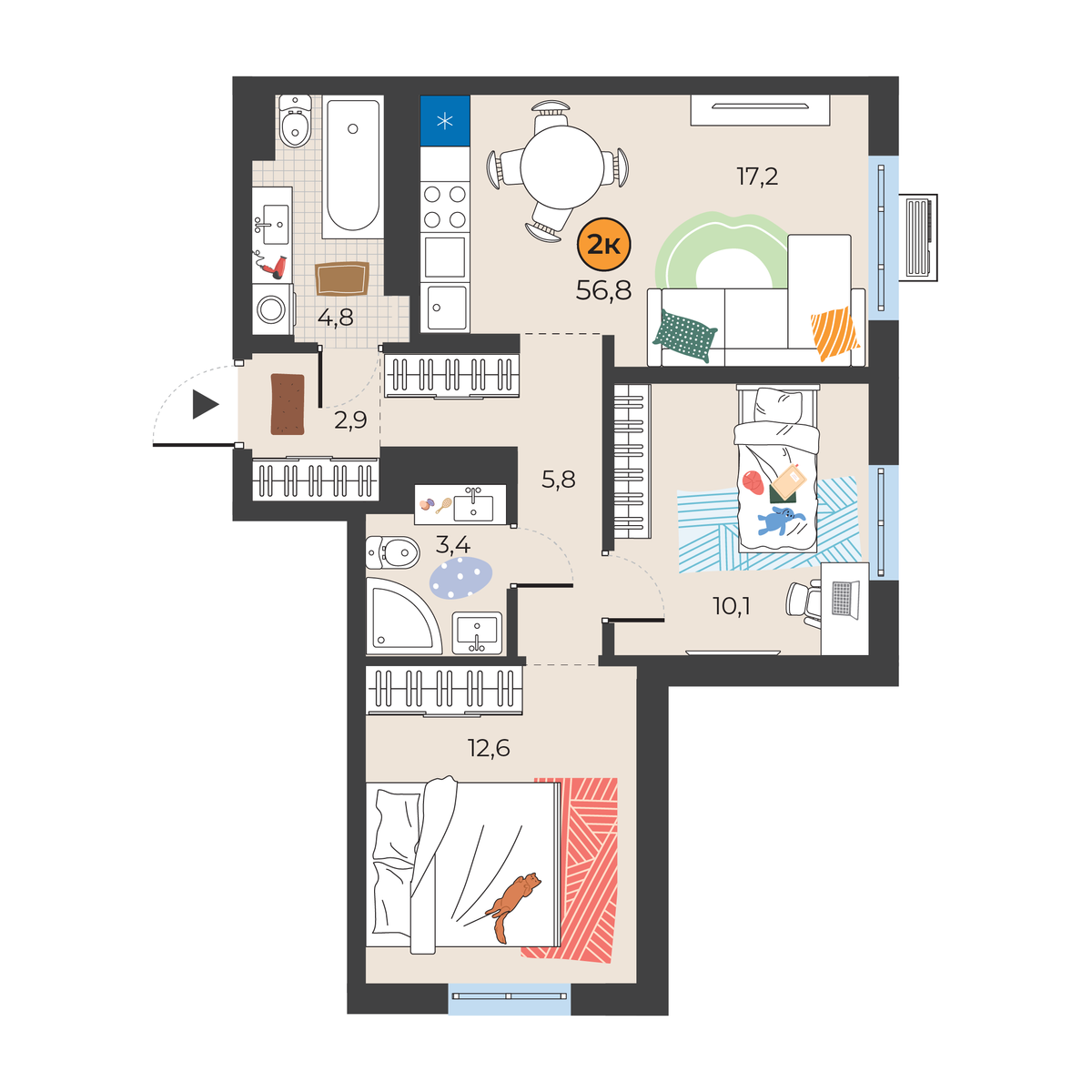 2-комнатная квартира 56.8 м2