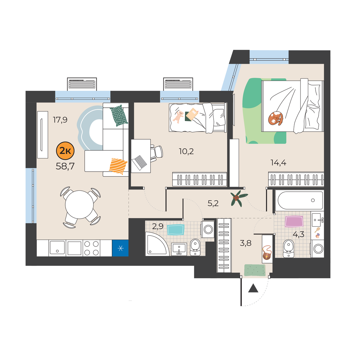 2-комнатная квартира 58.7 м2