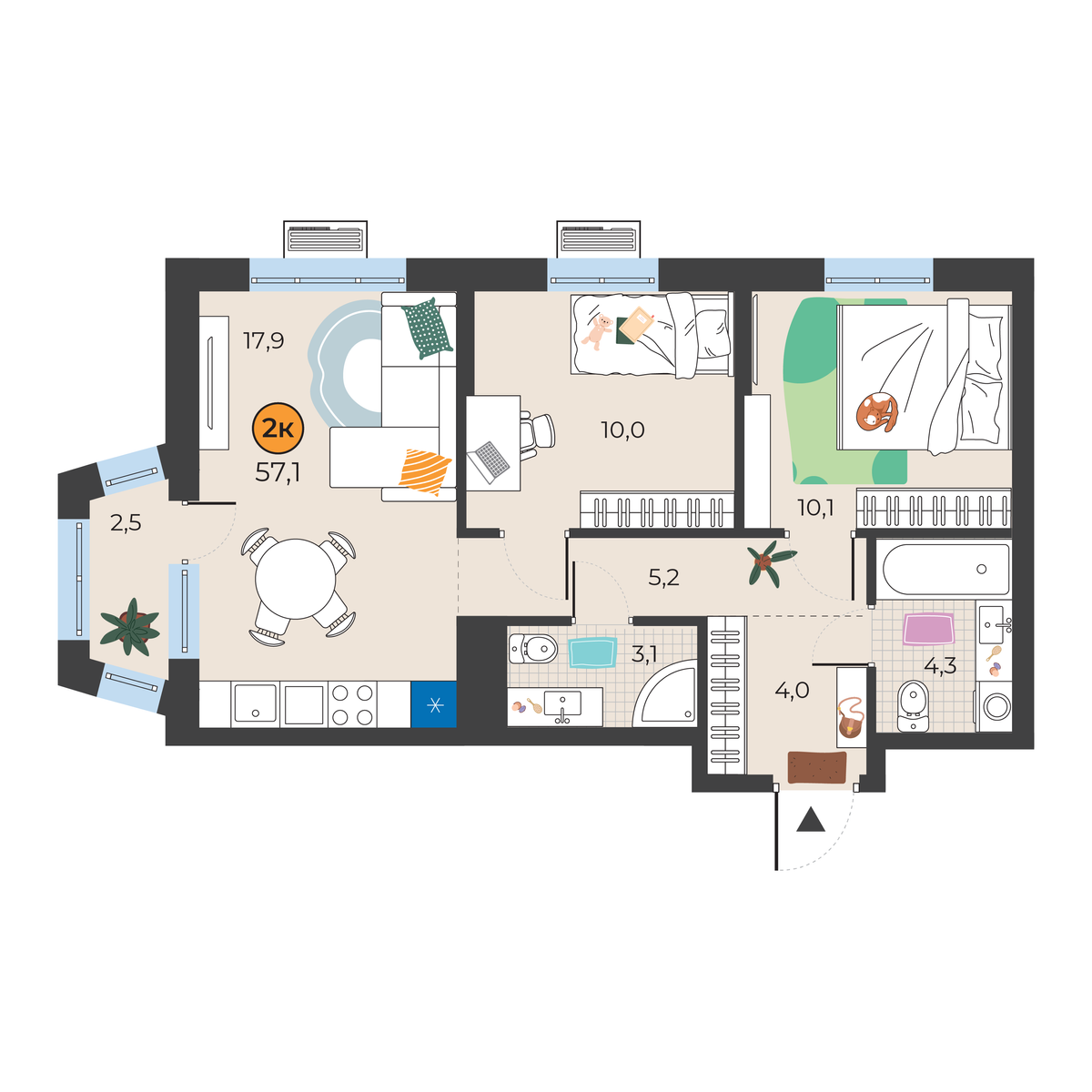 2-комнатная квартира 57.1 м2