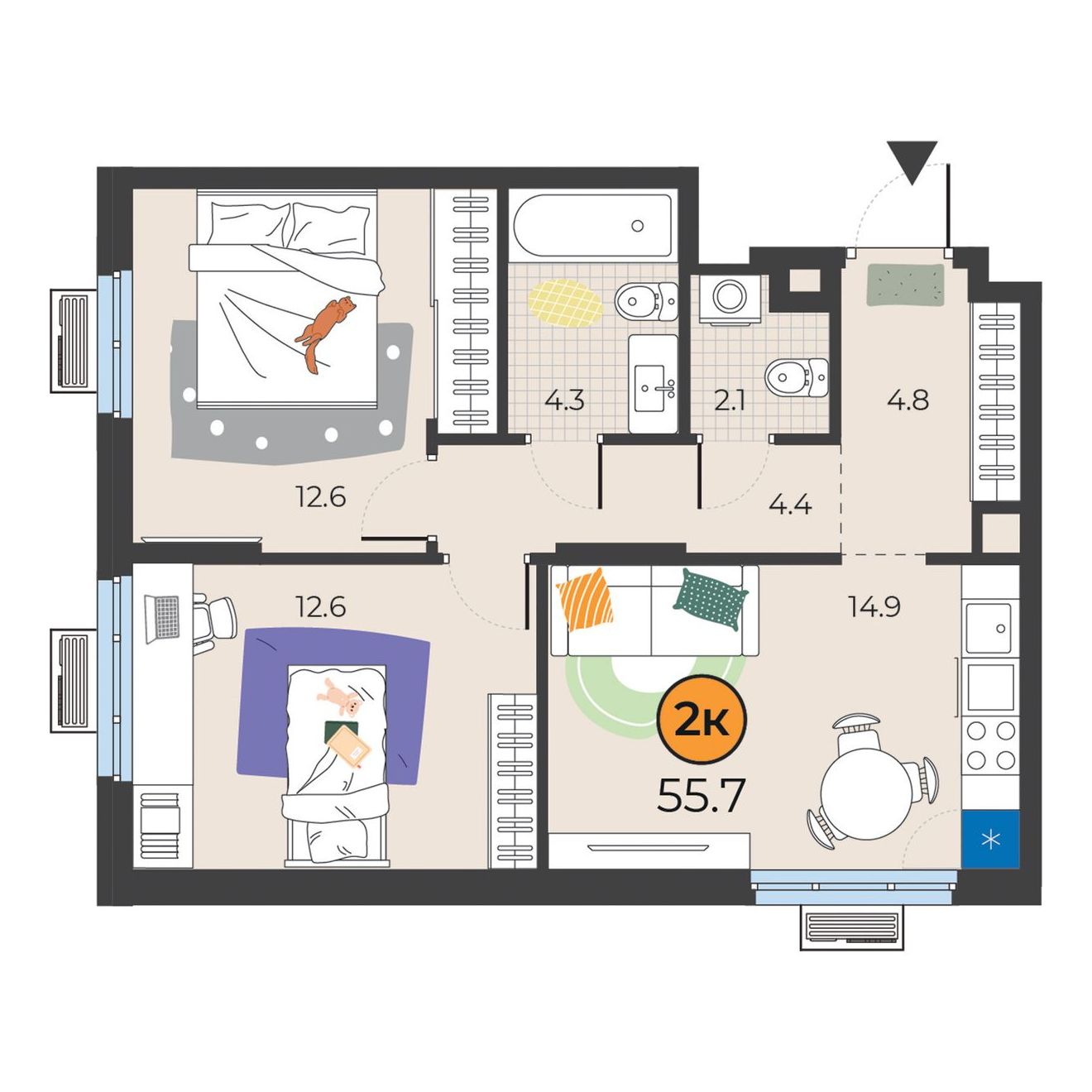 2-комнатная квартира 55.7 м2