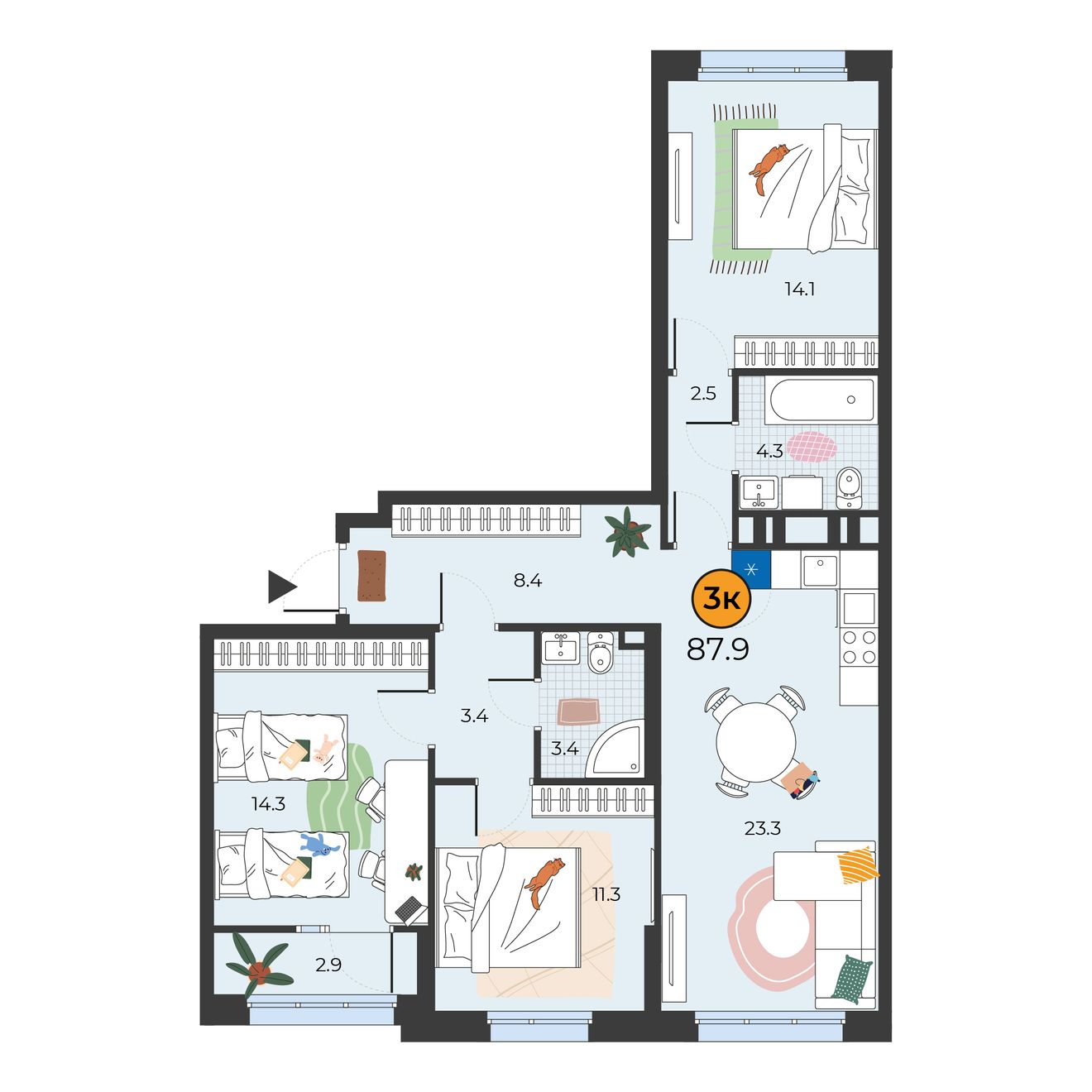 3-комнатная квартира 87.9 м2