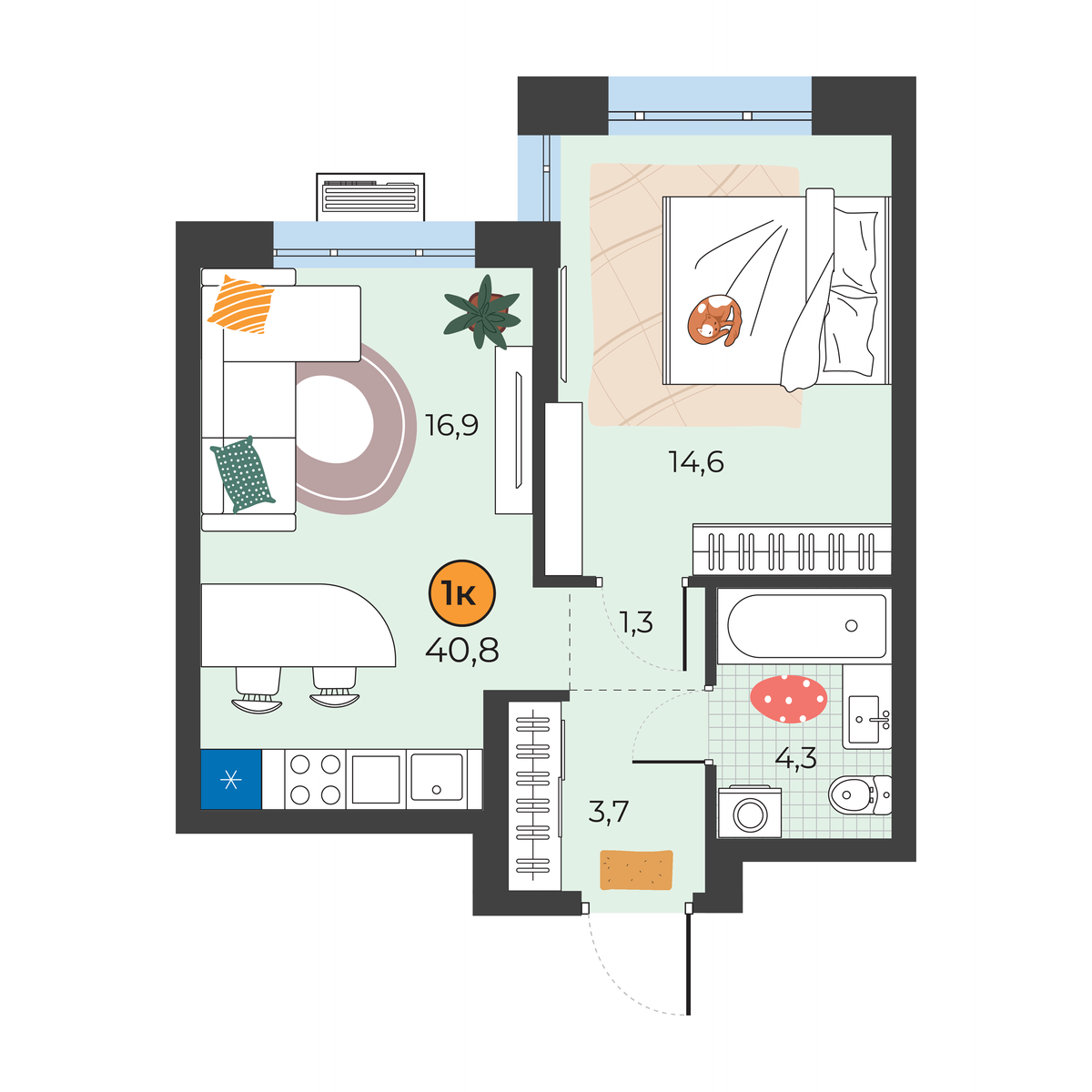 - Площадь40.8 м2