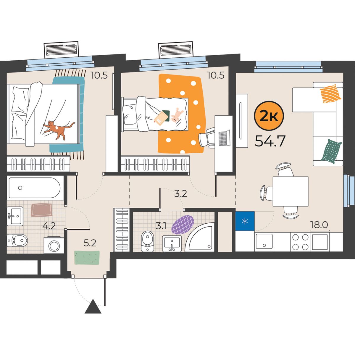 2-комнатная квартира 54.7 м2