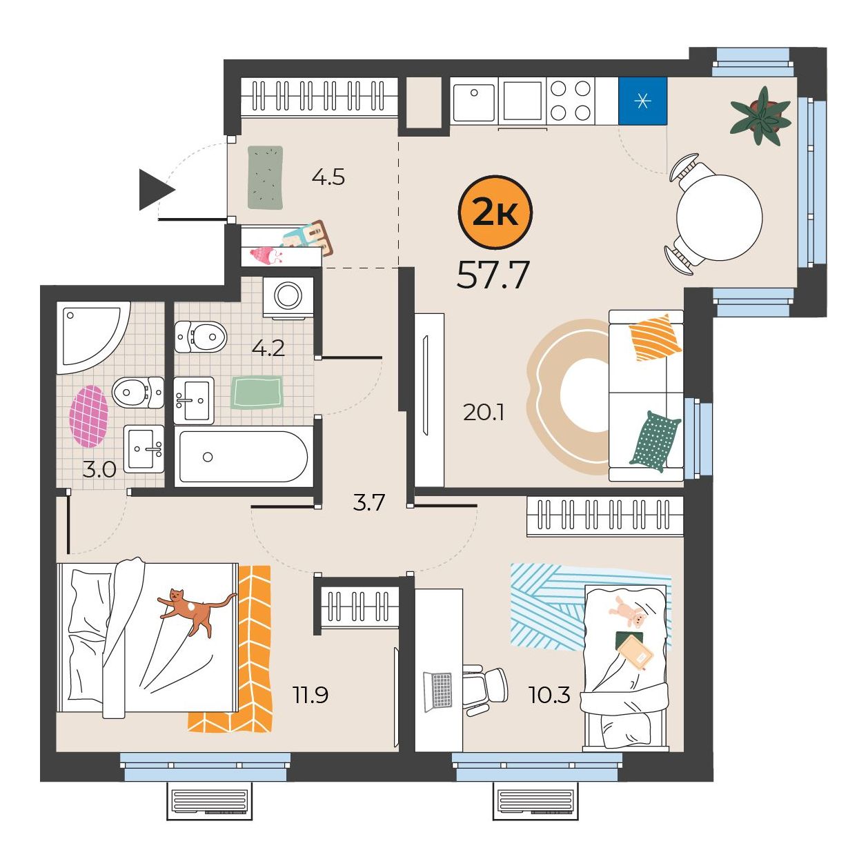 - Площадь57.7 м2