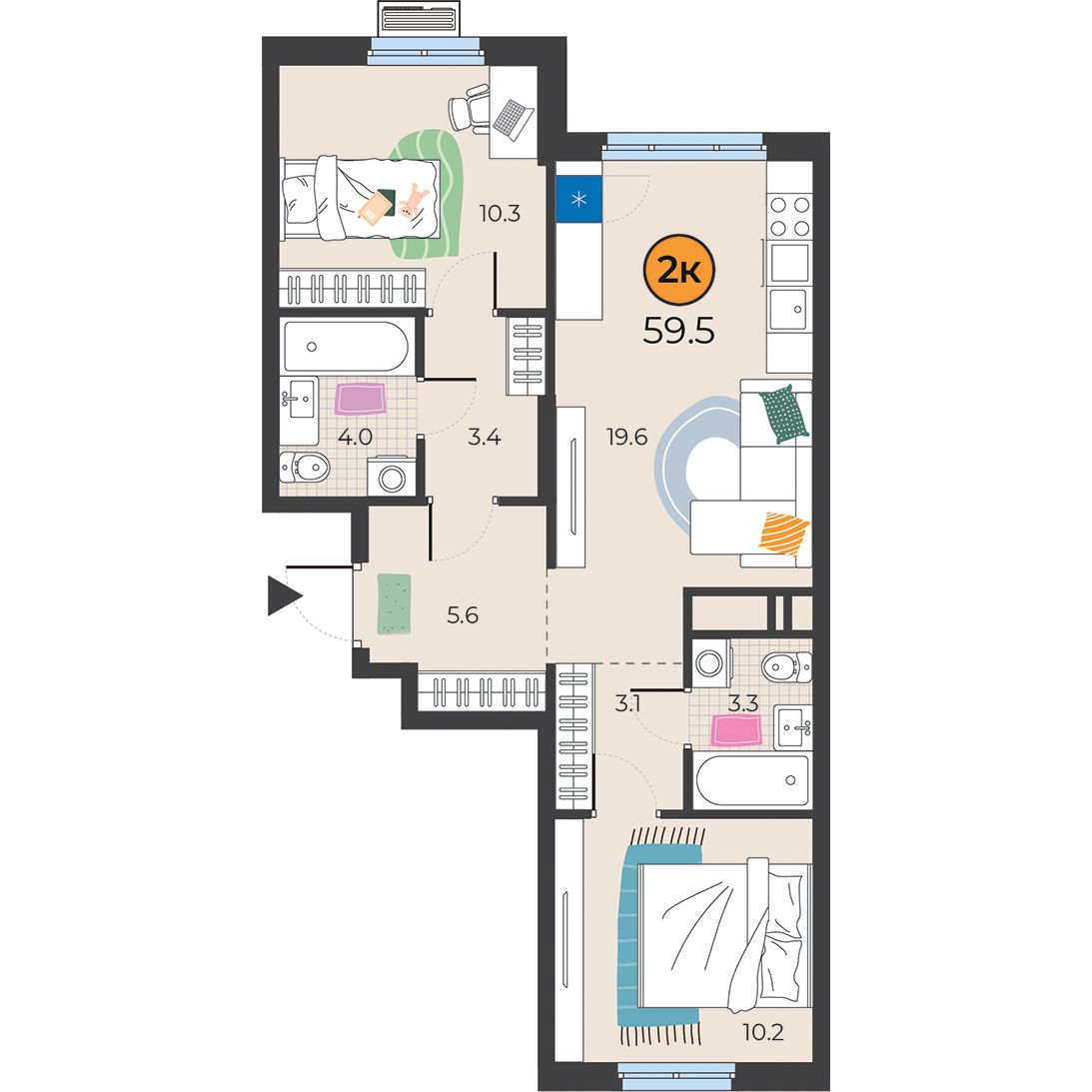 2-комнатная квартира 59.5 м2