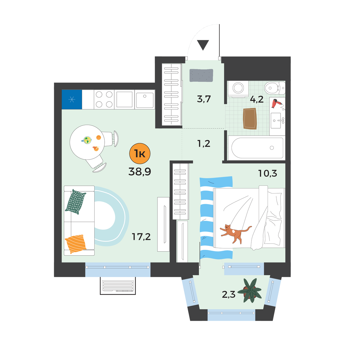 - Площадь38.9 м2