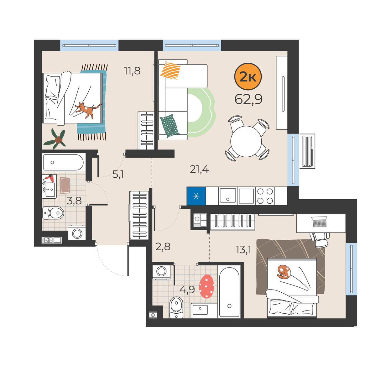 2-комнатная квартира 62.9 м2