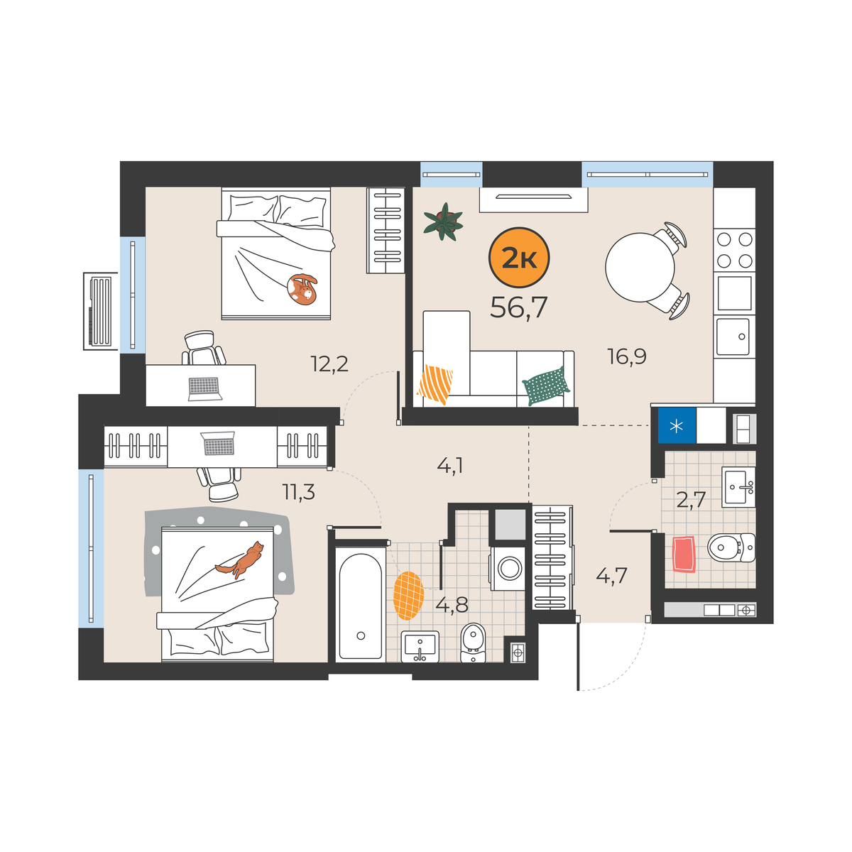 2-комнатная квартира 56.7 м2