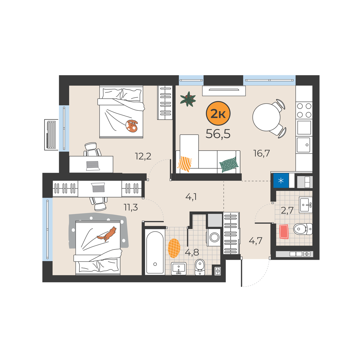 2-комнатная квартира 56.5 м2