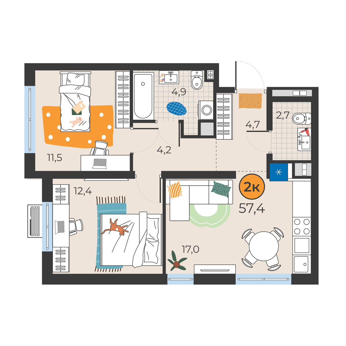 2-комнатная квартира 57.4 м2