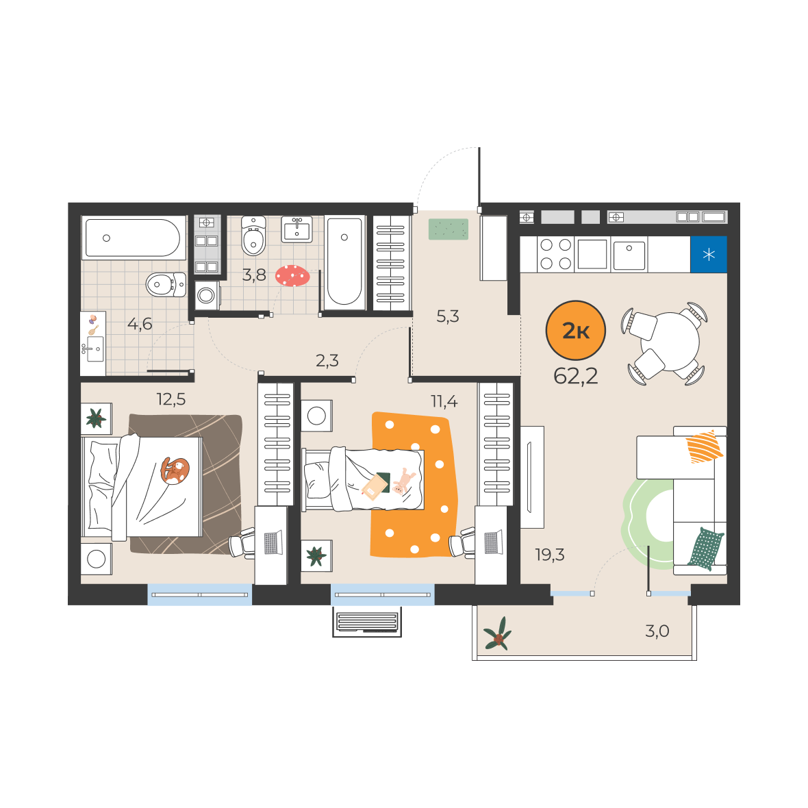 2-комнатная квартира 62.2 м2