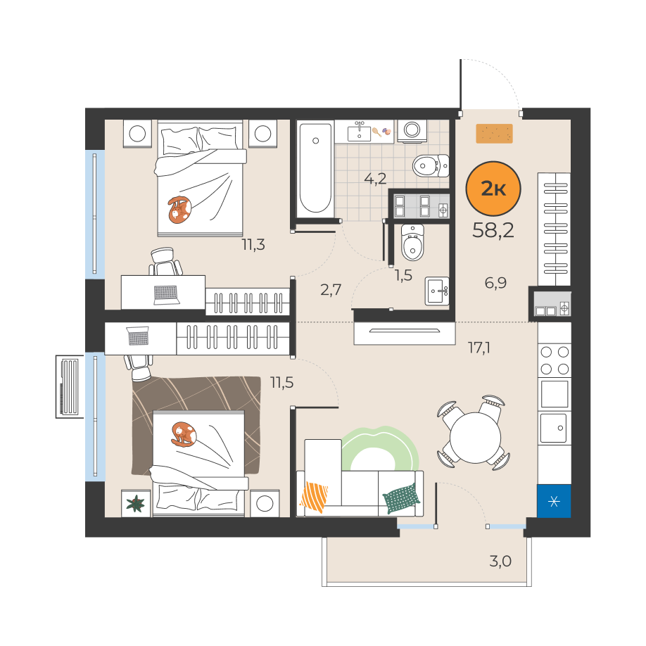 2-комнатная квартира 58.2 м2