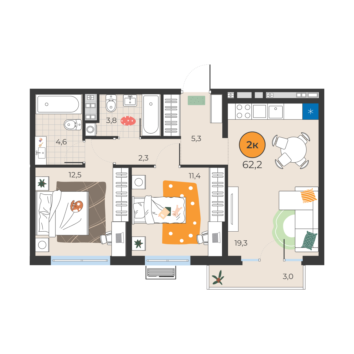 2-комнатная квартира 62.2 м2