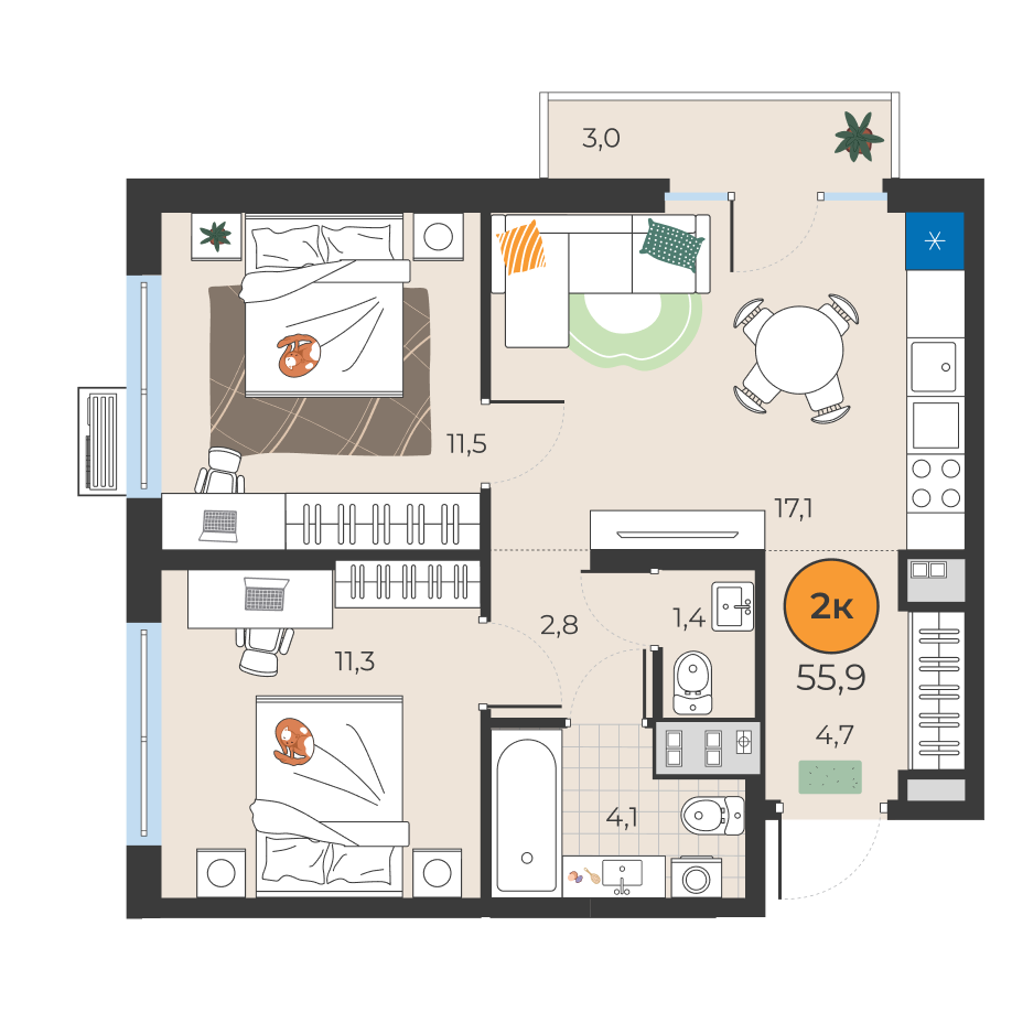 2-комнатная квартира 55.9 м2