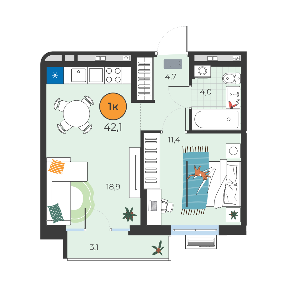 1-комнатная квартира 42.1 м2