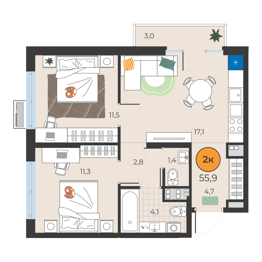 2-комнатная квартира 55.9 м2
