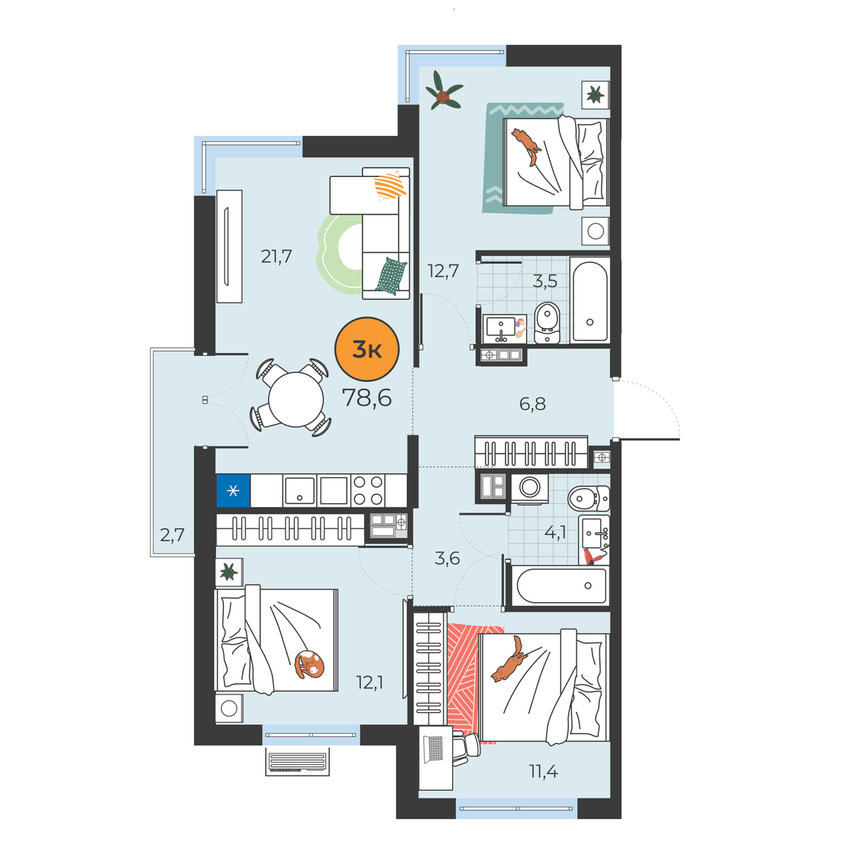 3-комнатная квартира 78.6 м2