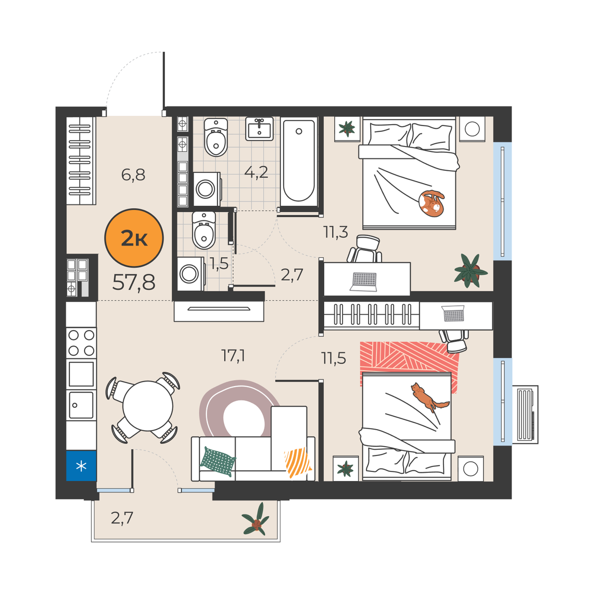 2-комнатная квартира 57.8 м2
