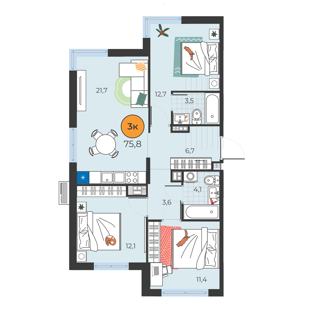 3-комнатная квартира 75.8 м2