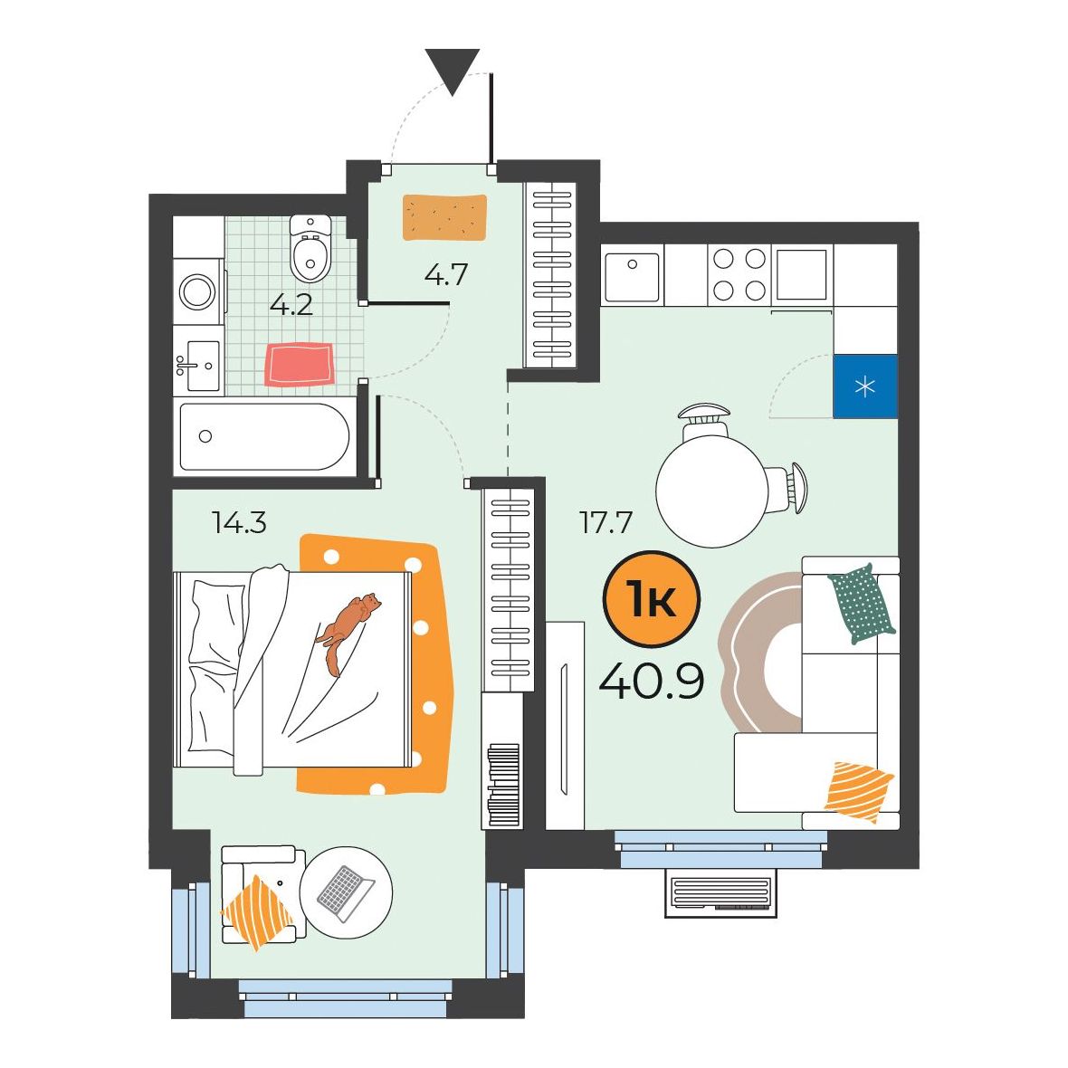 1-комнатная квартира 40.9 м2