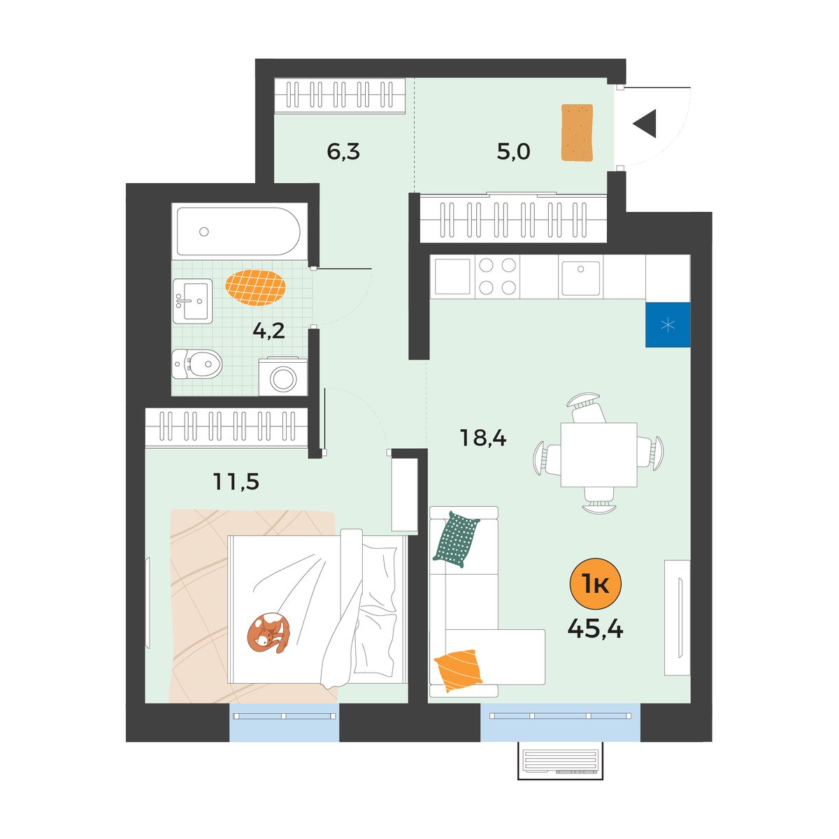 1-комнатная квартира 45.4 м2