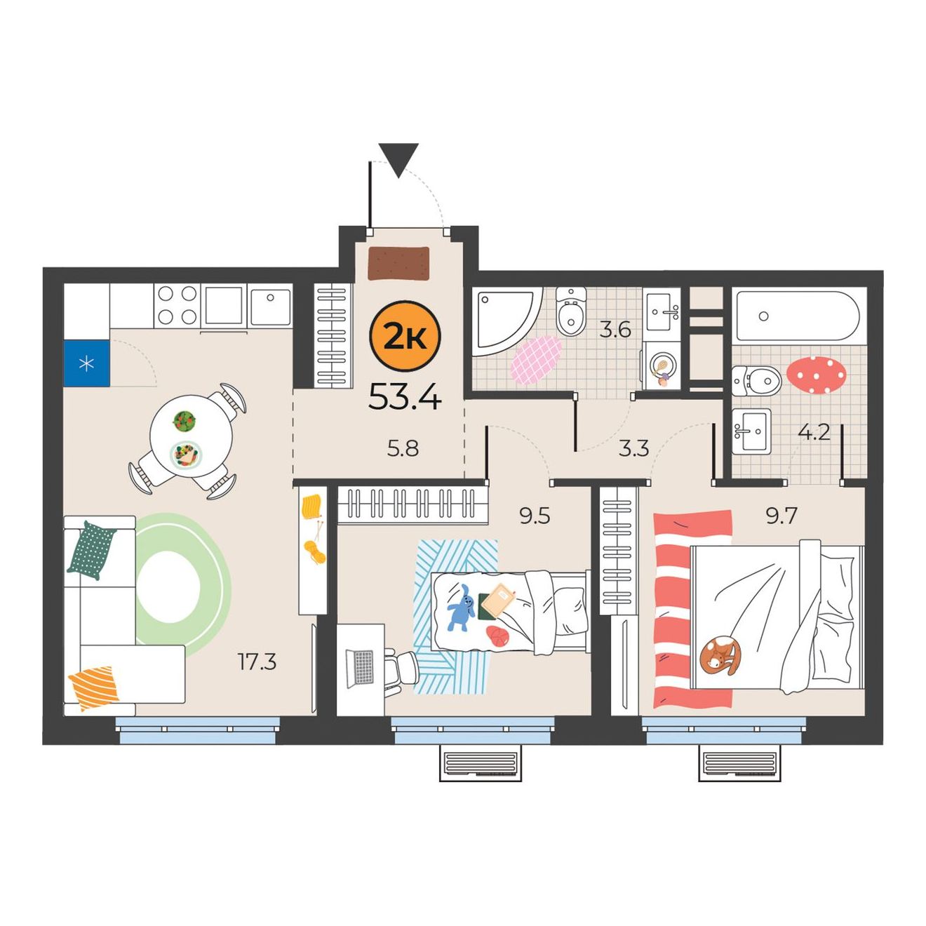 2-комнатная квартира 53.4 м2
