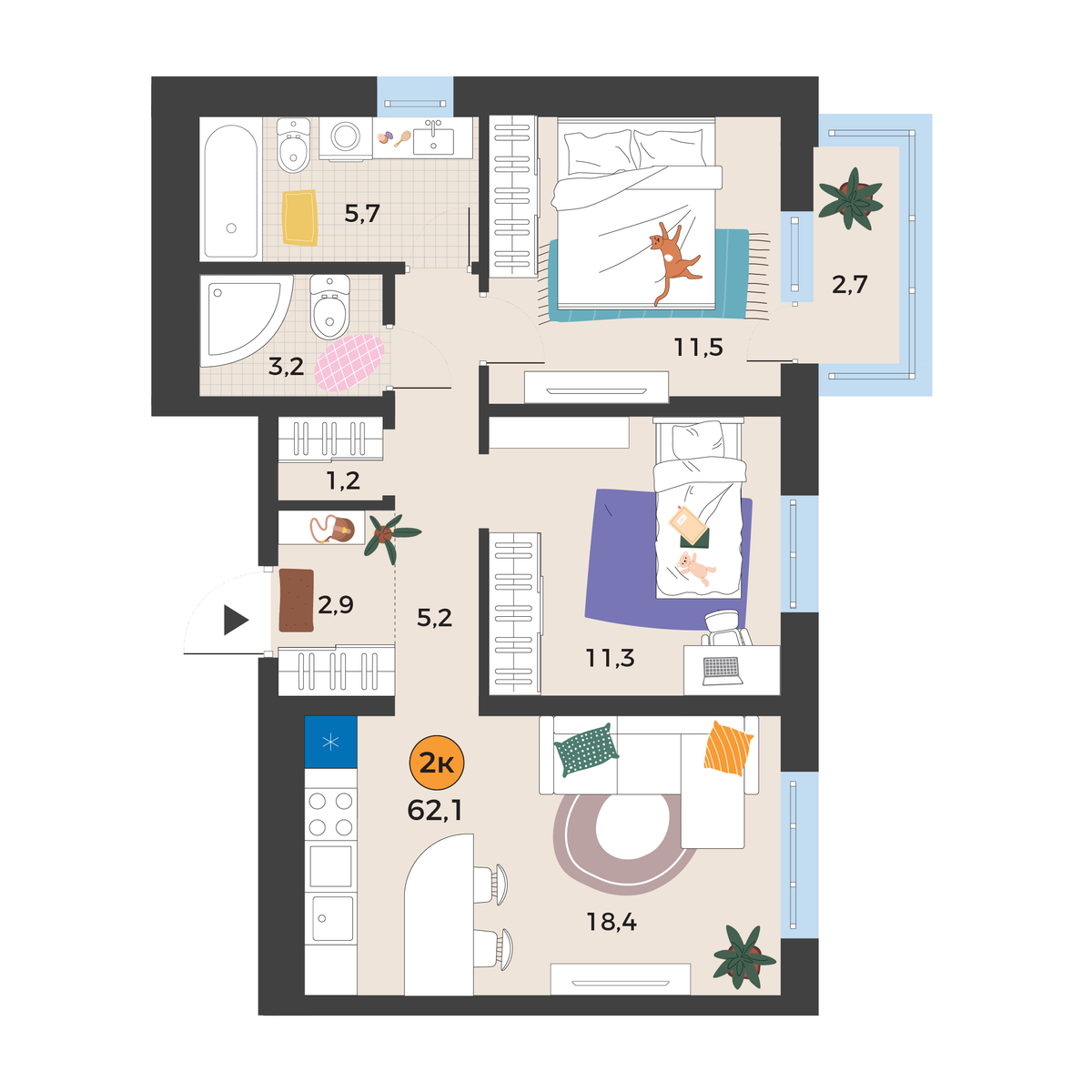 2-комнатная квартира 62.1 м2